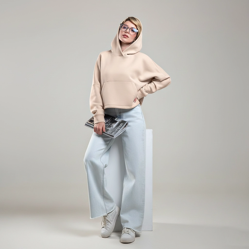 مدل کراپ (Cropped) یا نیمتنه آن، برای ست شدن عالی با شلوارهای فاق بلند، لگینگها و دامنها طراحی شده است و به استایل شما جلوهای امروزی میبخشد. این هودی با کلاه و آستینهای بلند، علاوه بر گرما، یک استایل خیابانی جذاب و راحت را فراهم میکند.