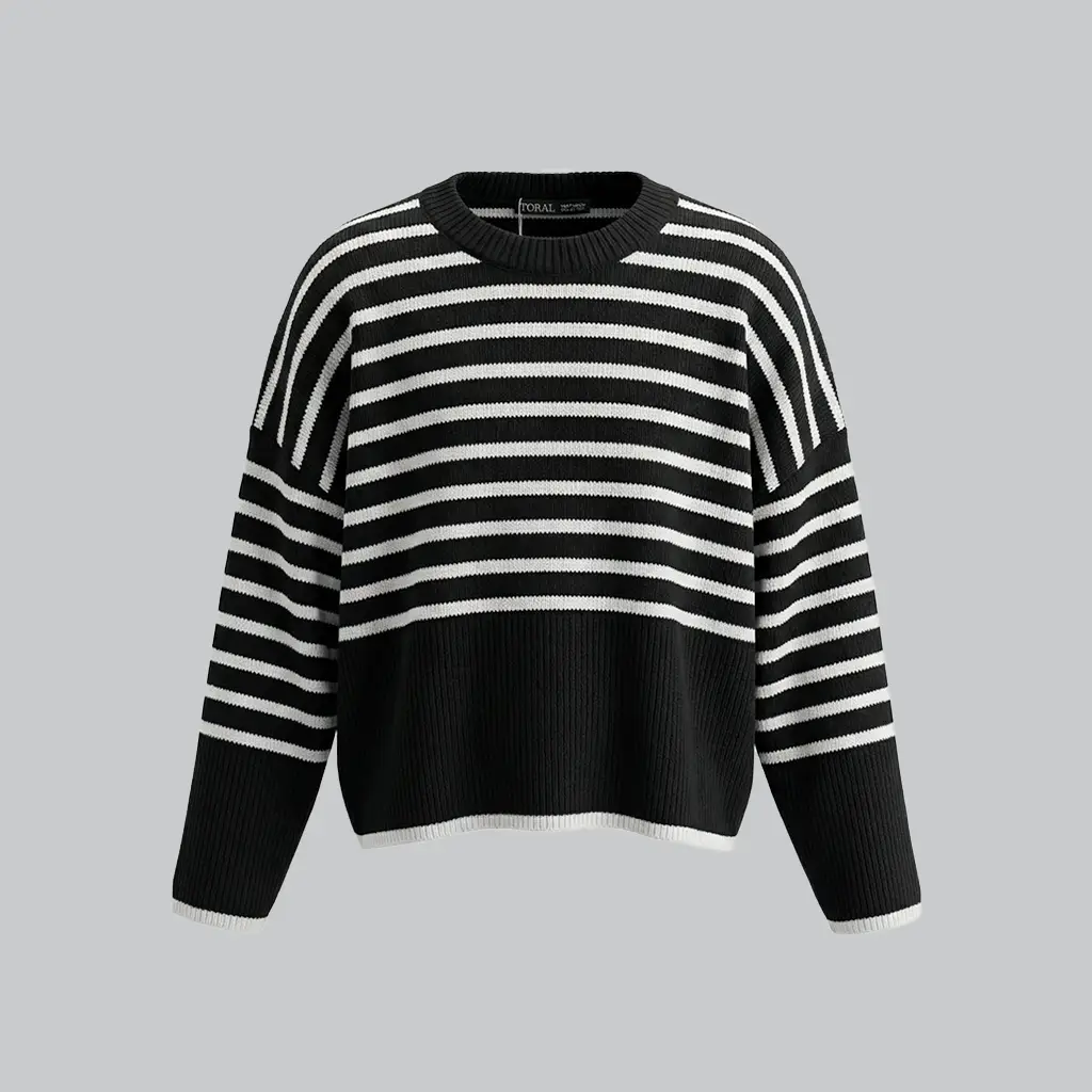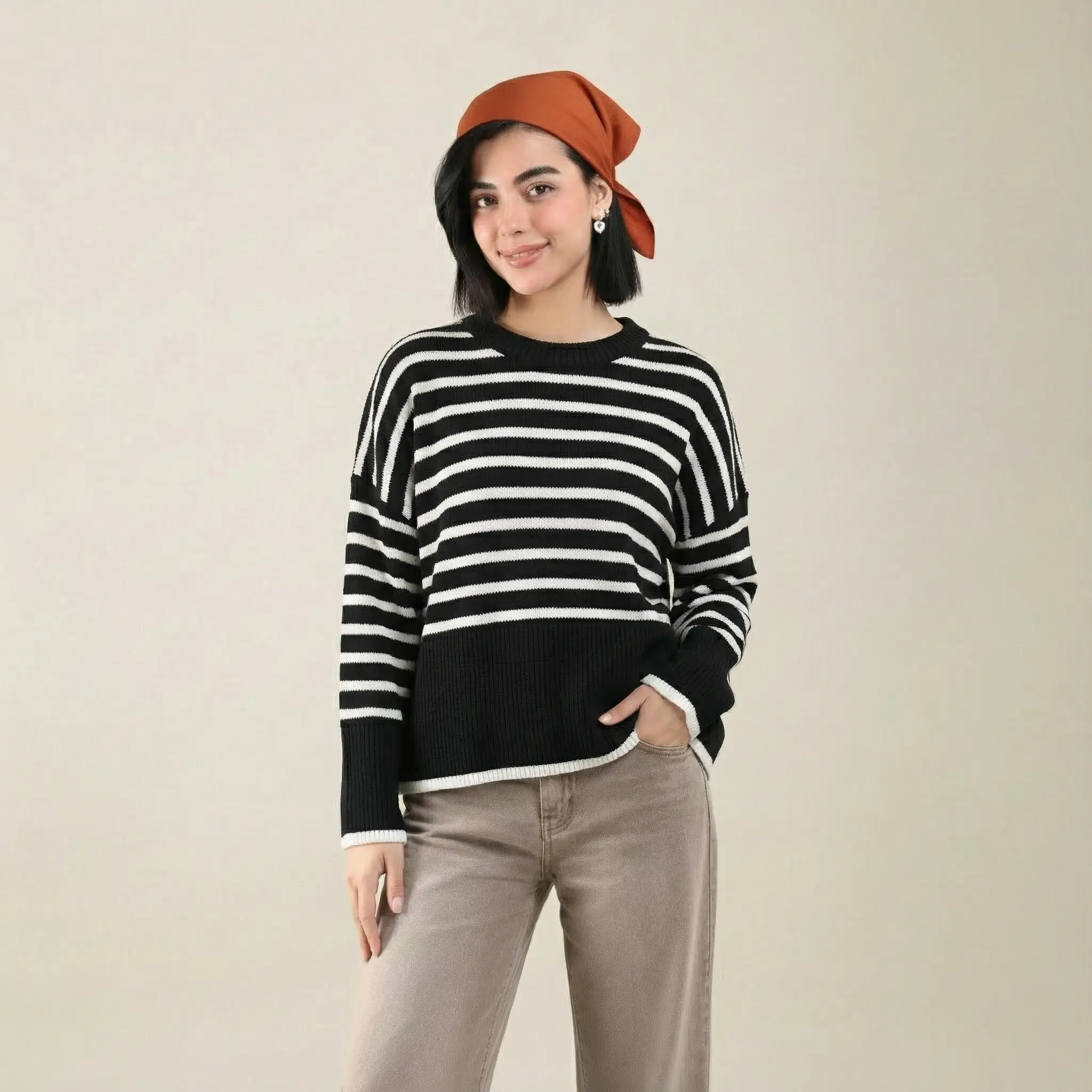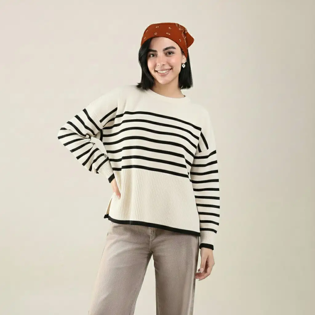 این بلوز بافت راه راه یک آیتم کژوال و شیک برای فصول خنک تا سرد است. طرح راه راه افقی این بلوز، یک الگوی کلاسیک و پرطرفدار است که به راحتی با شلوارها و دامنهای ساده ست میشود و استایلی دریایی (Naval) یا فرانسوی را تداعی میکند.